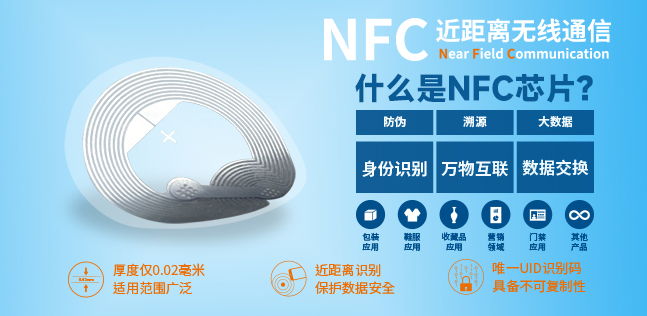 近场通信(Near Field Communication,简称NFC),使用了NFC技术的设备(例如移动电话)可以在彼此近的情况下进行数据交换,是由非接触式射频识别(RFID)及与连与通技术整合演变而来的,通过在单一芯片上集成感应式读卡器、感应式卡片和点对点通信的功能,利用移动终端实现防伪溯源、移动支付、电子票务、门禁、移动身份识别等应用。